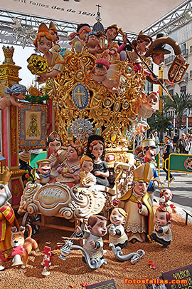 De entre todos los festejos que se realizaron hace cien años sobresalió la gran cabalgata de la Coronación, una procesión formada por once carrozas alegóricas. Una de estas carrozas, diseñada por el escultor Vicent Benedito, era una reproducción a gran escala de la corona que se le había regalado a la Virgen, y levaba por título 'Valencia le hace la Corona'.