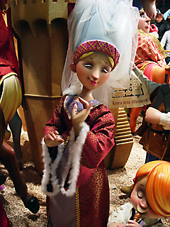 "Juries in the city receive the monarch by the Serranos towers where the Guardian Angel of Valencia is ready to give the key of the city to King. The monarchs, riding, meanwhile bring a precious relic: the Holy Chalice of the Last Supper. The entourage is made up of members of the court, include famous poets and writers as Ausias March, Jordi de Sant Jordi and Jaume Roig."