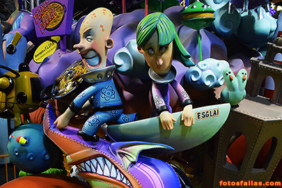 "Como remate central y epicentro de la falla, tenemos un hongo nuclear que no solamente ha alterado nuestro planeta, sin también todas las galaxias que lo rodean, puesto que gran parte dela Humanidad se ha visto obligada a emigrar para seguir viviendo y por supuesto, para seguir manteniendo viva Las Fallas. "